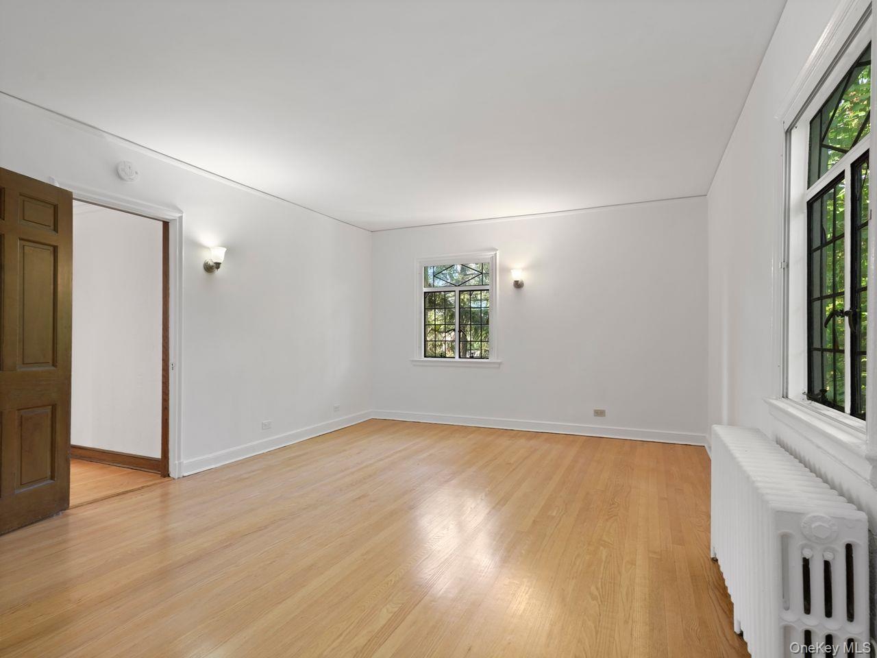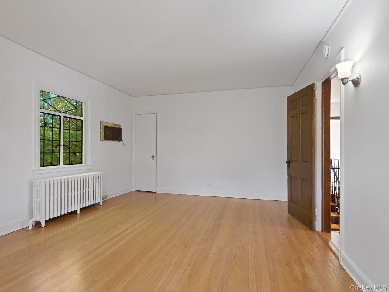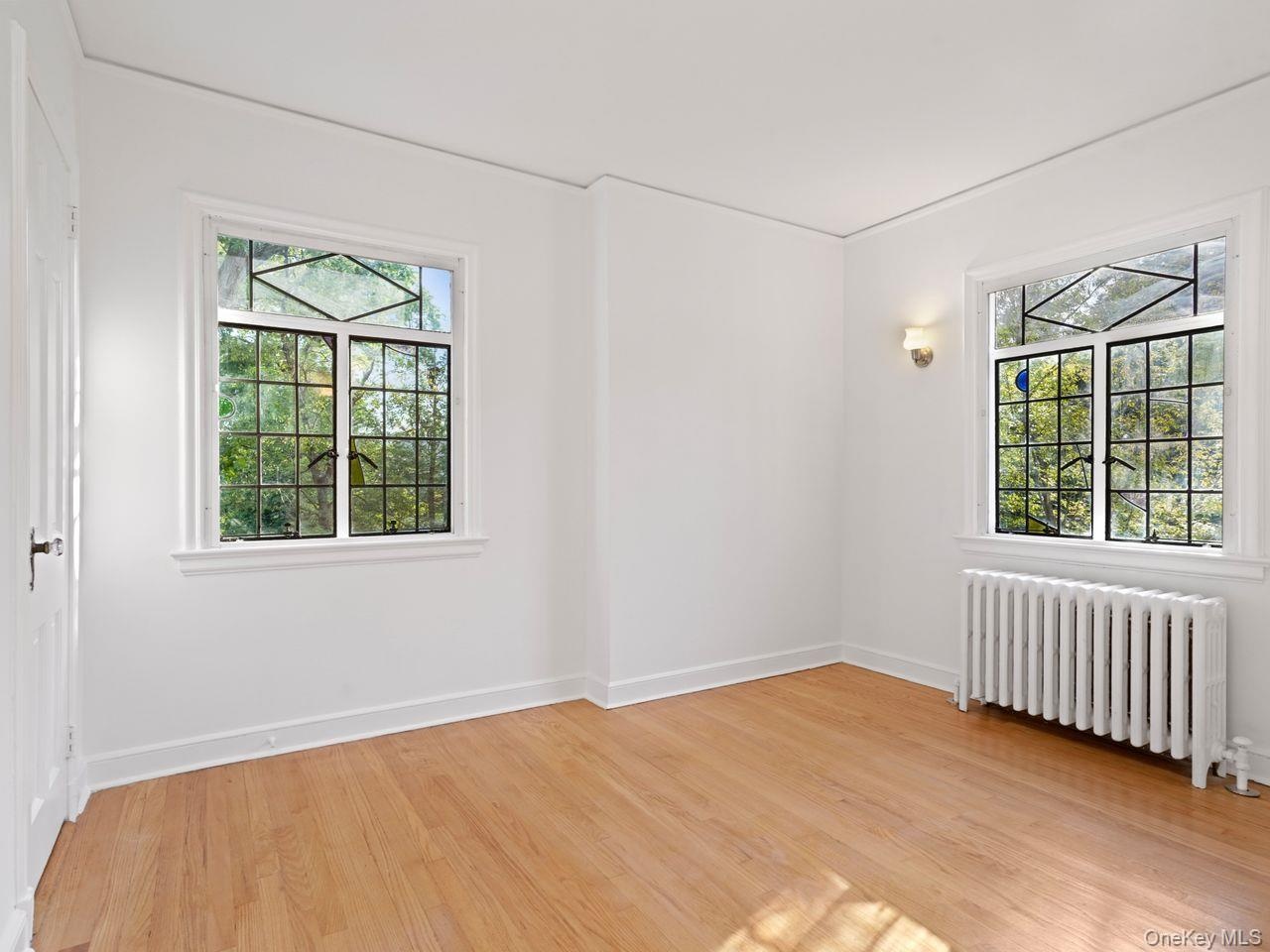 - Unfurnished room featuring radiator heating unit and light wood-type flooring