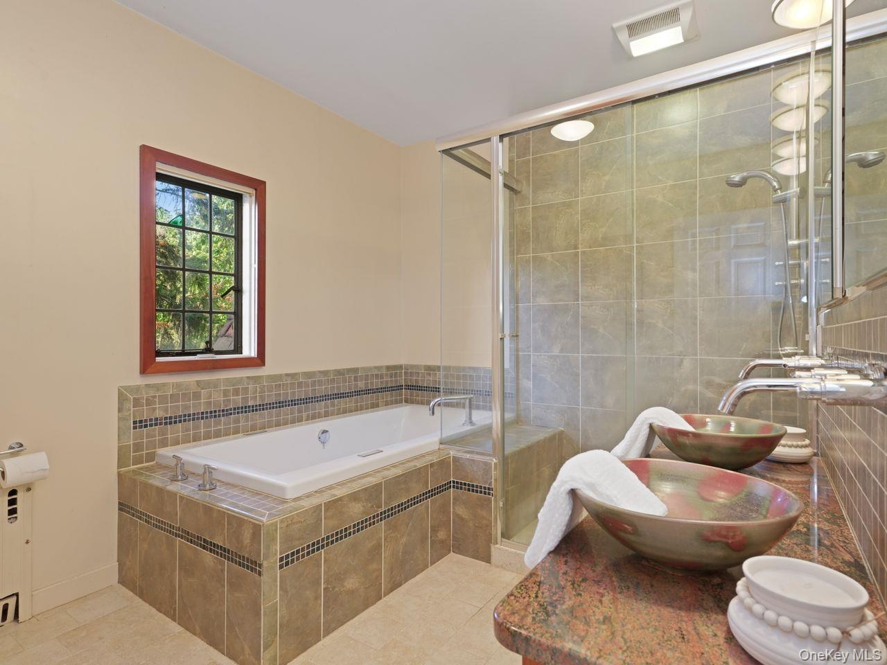 - Full primary bath featuring a spa tub, a stall shower, tile flooring, and double vanity
