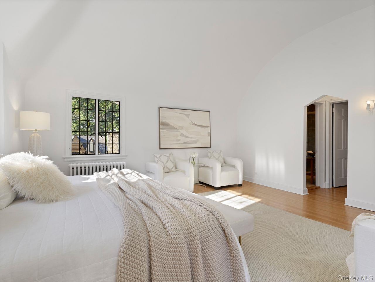 - Bedroom with lofted ceiling, wood finished floors, radiator, and arched walkways