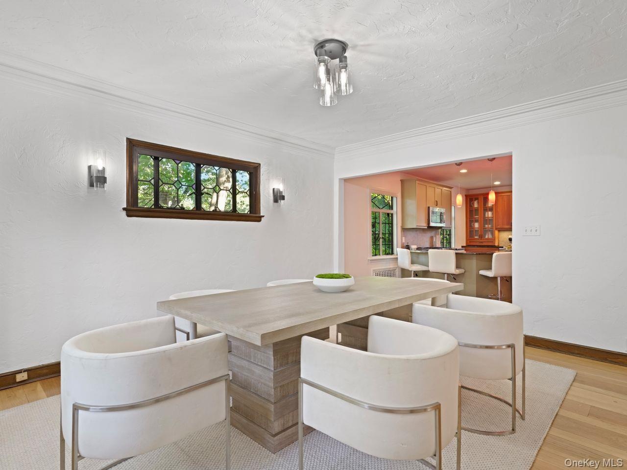- Dining room with light wood-type flooring, crown molding, and a textured ceiling