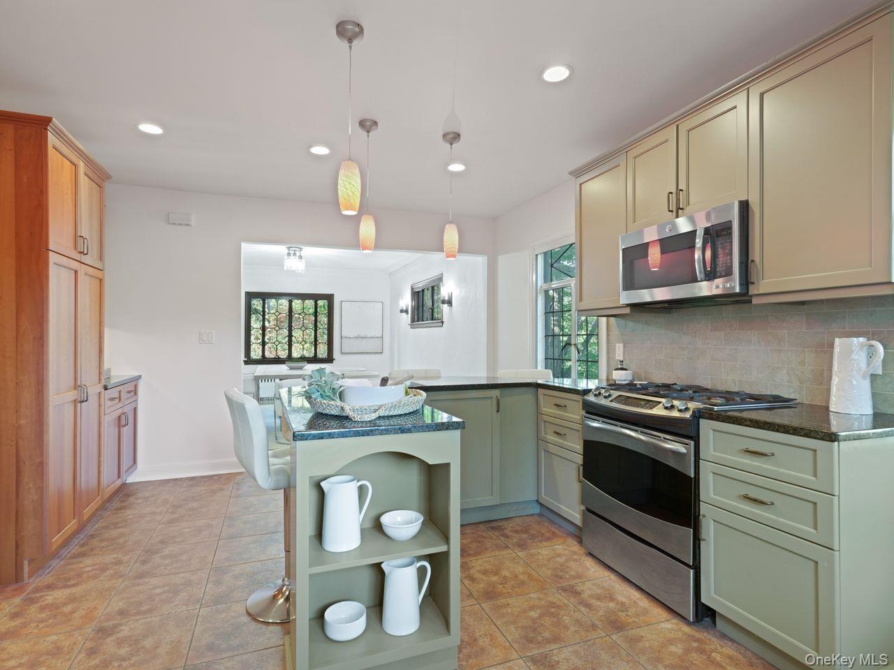 - Kitchen with appliances with stainless steel finishes, green cabinets, pendant lighting, open shelves, and recessed lighting