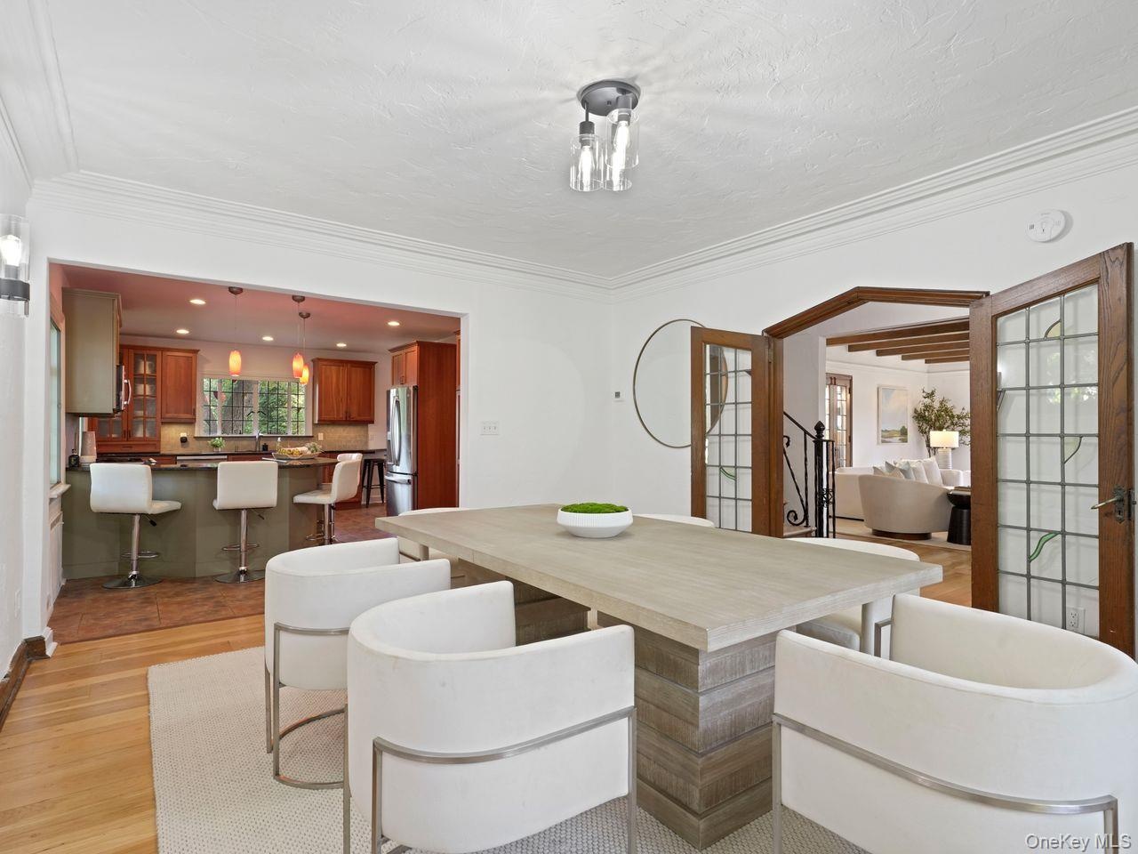 - Dining area with ornamental molding, light wood-style floors, and french doors