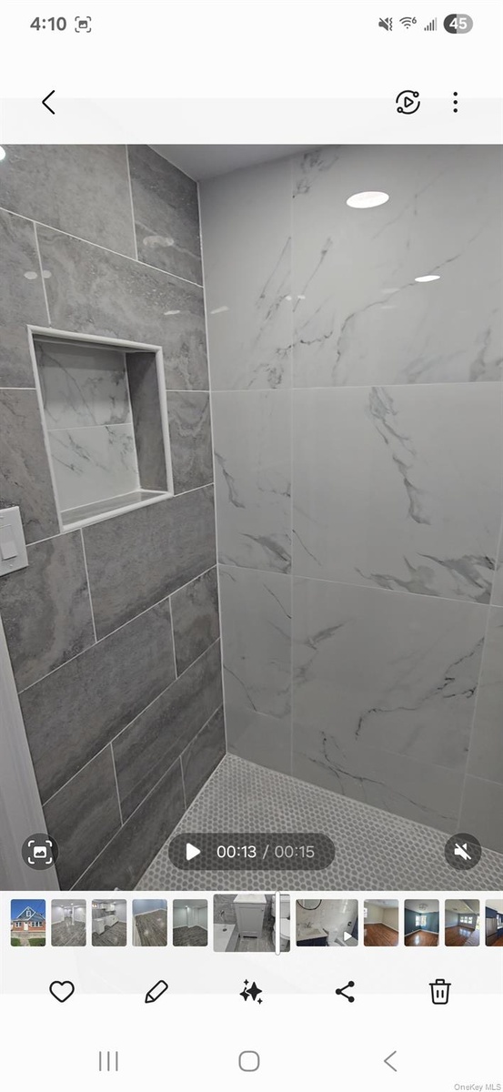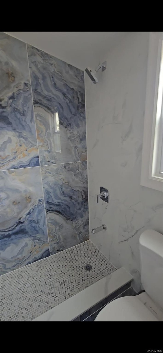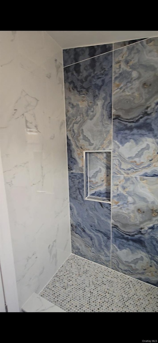 - Bathroom with a marble finish shower