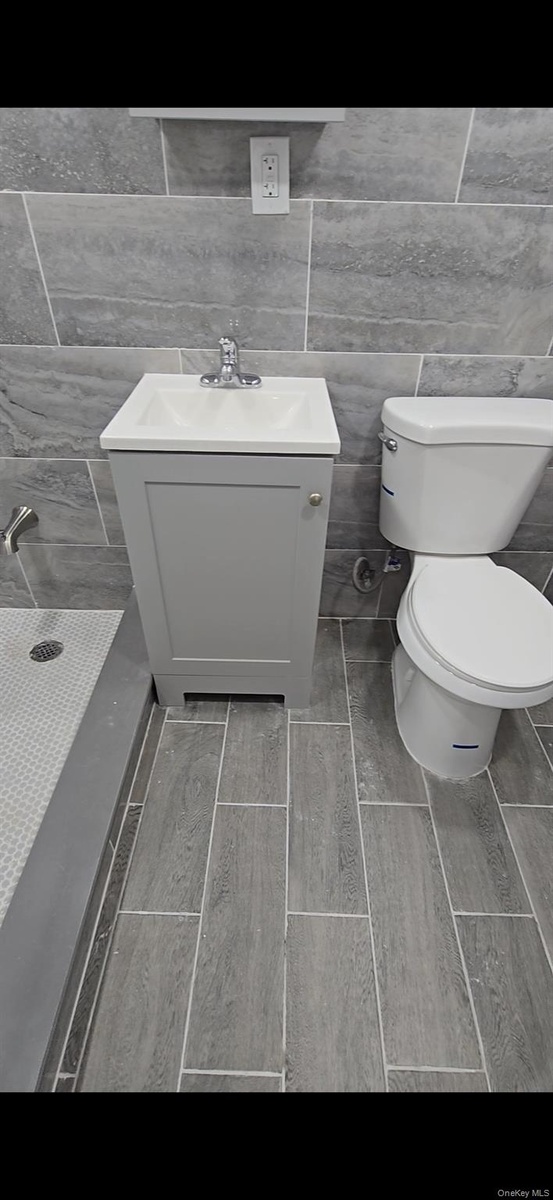 - Bathroom featuring wood finish floors, tile walls, and vanity