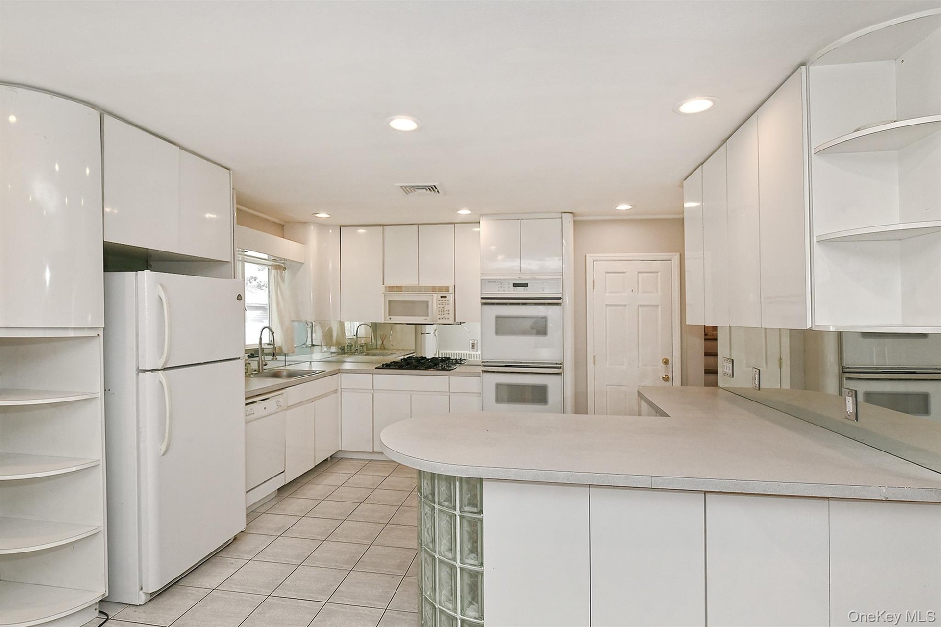 - Kitchen with open shelves, white cabinets, white appliances, a peninsula, and light countertops