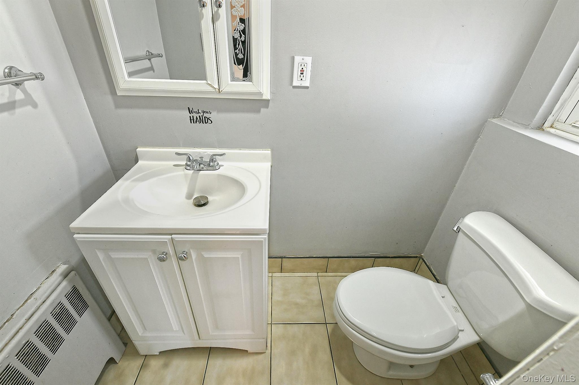 - Half bath with light tile patterned floors and vanity