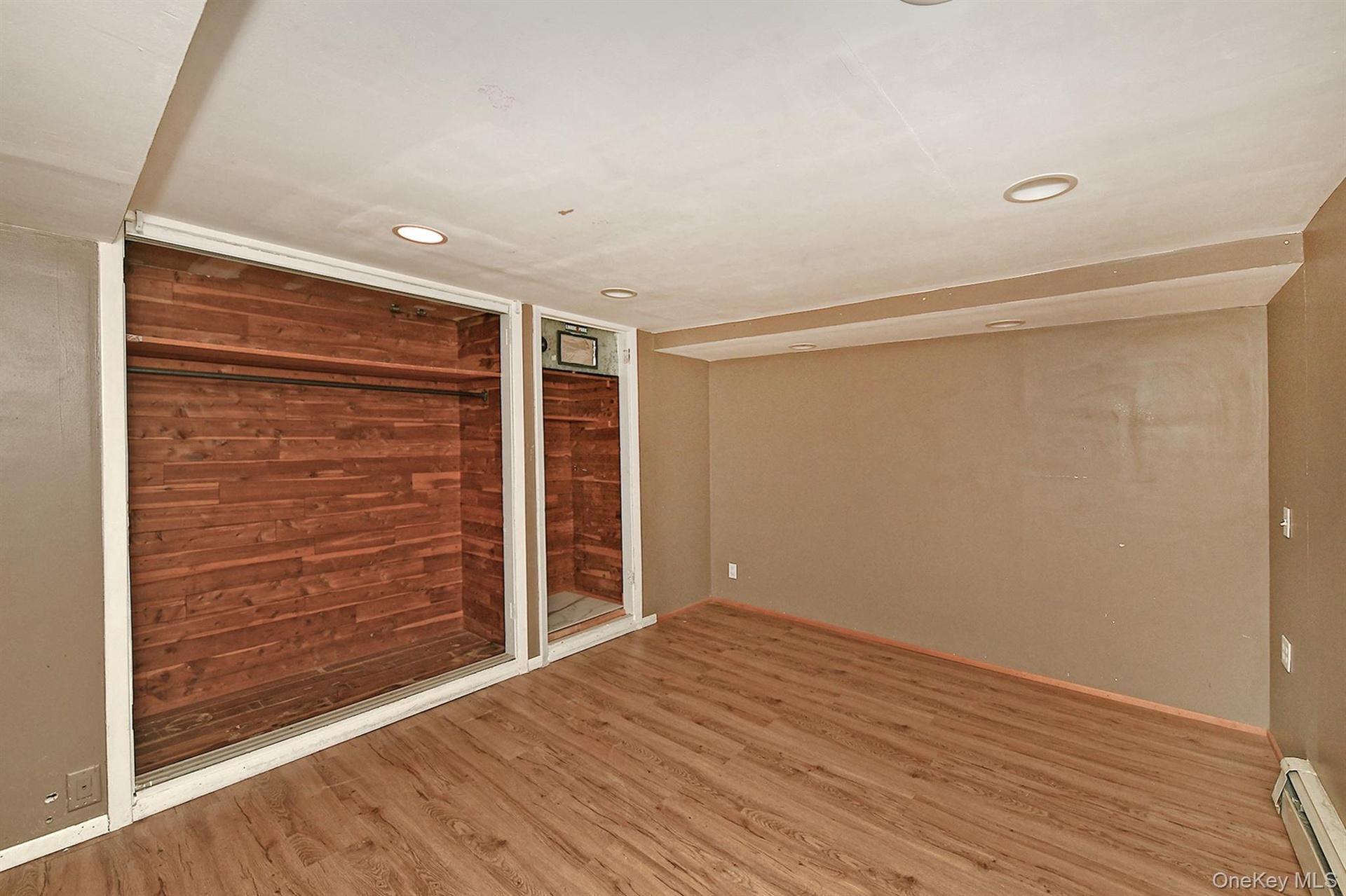 - Unfurnished bedroom featuring wooden walls, wood finished floors, a baseboard radiator, a closet, and recessed lighting