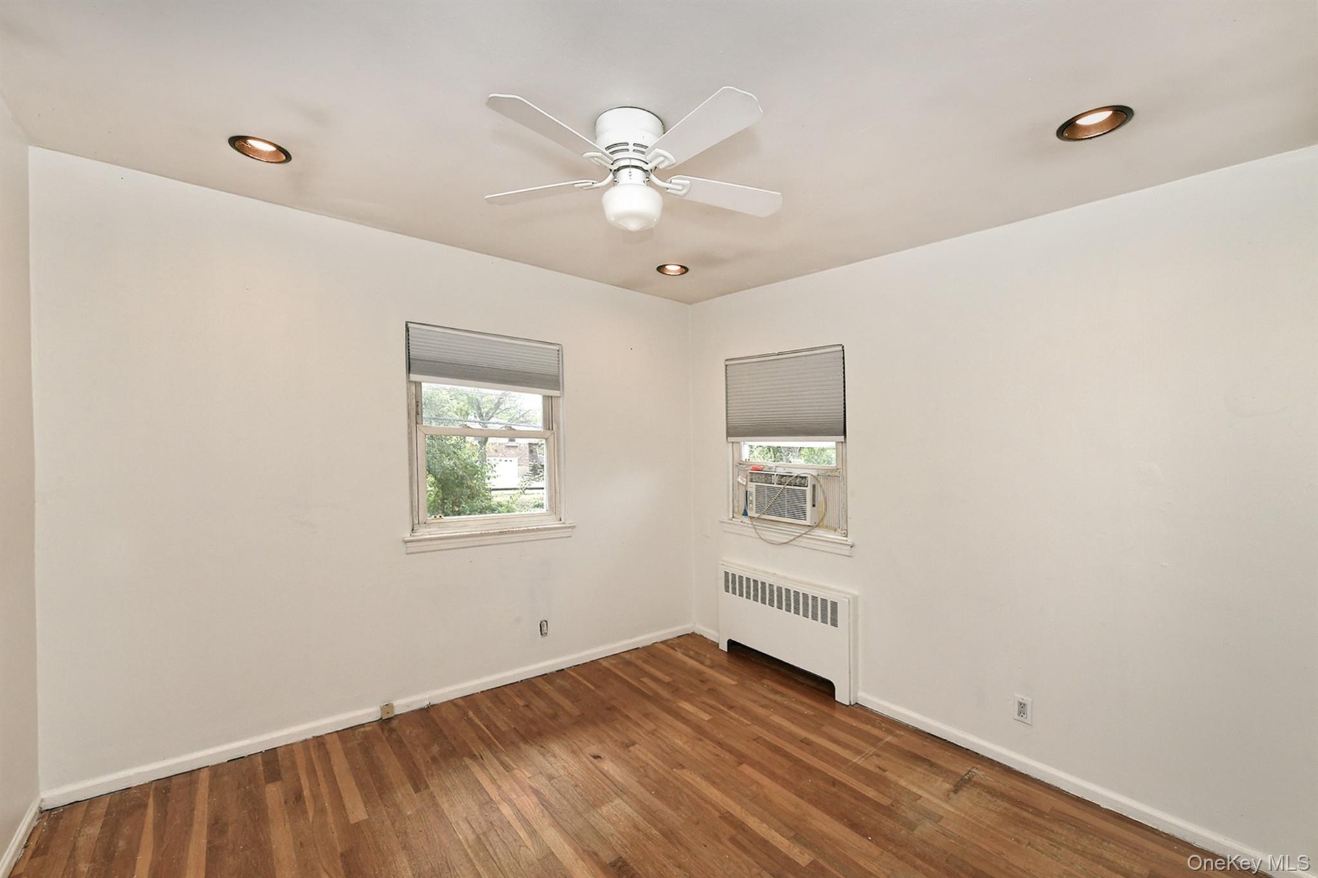 - Spare room featuring wood finished floors, radiator heating unit, recessed lighting, ceiling fan, and cooling unit