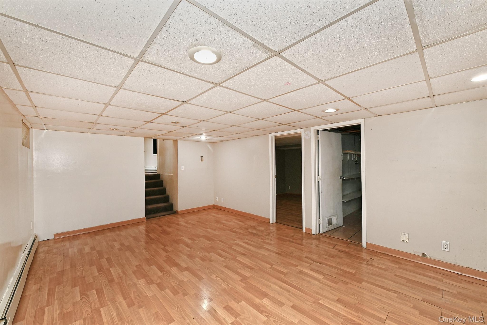 - Finished basement featuring baseboard heating, light wood-style floors, stairs, and a paneled ceiling