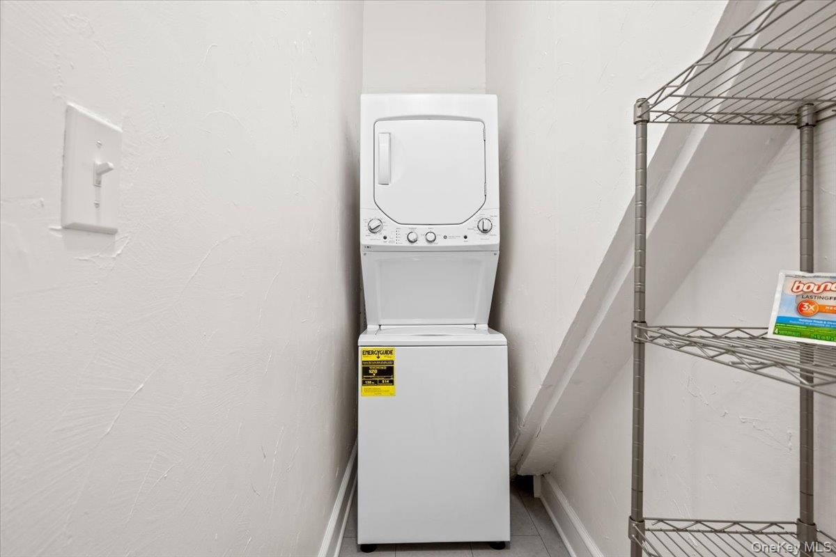 - Laundry area with stacked washing machine and dryer and tile patterned floors