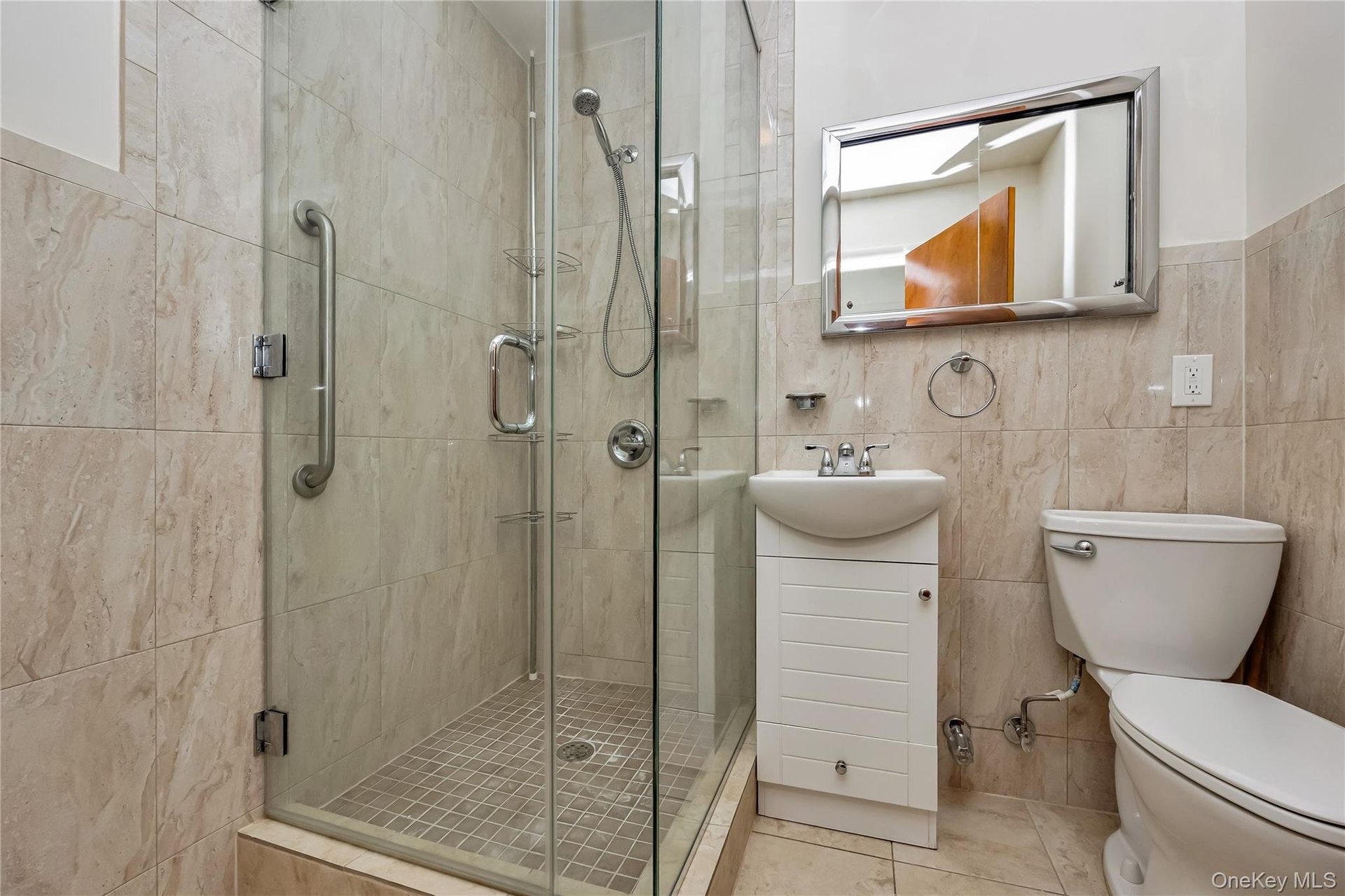 - Full bath with tile walls, vanity, a stall shower, and tile patterned flooring