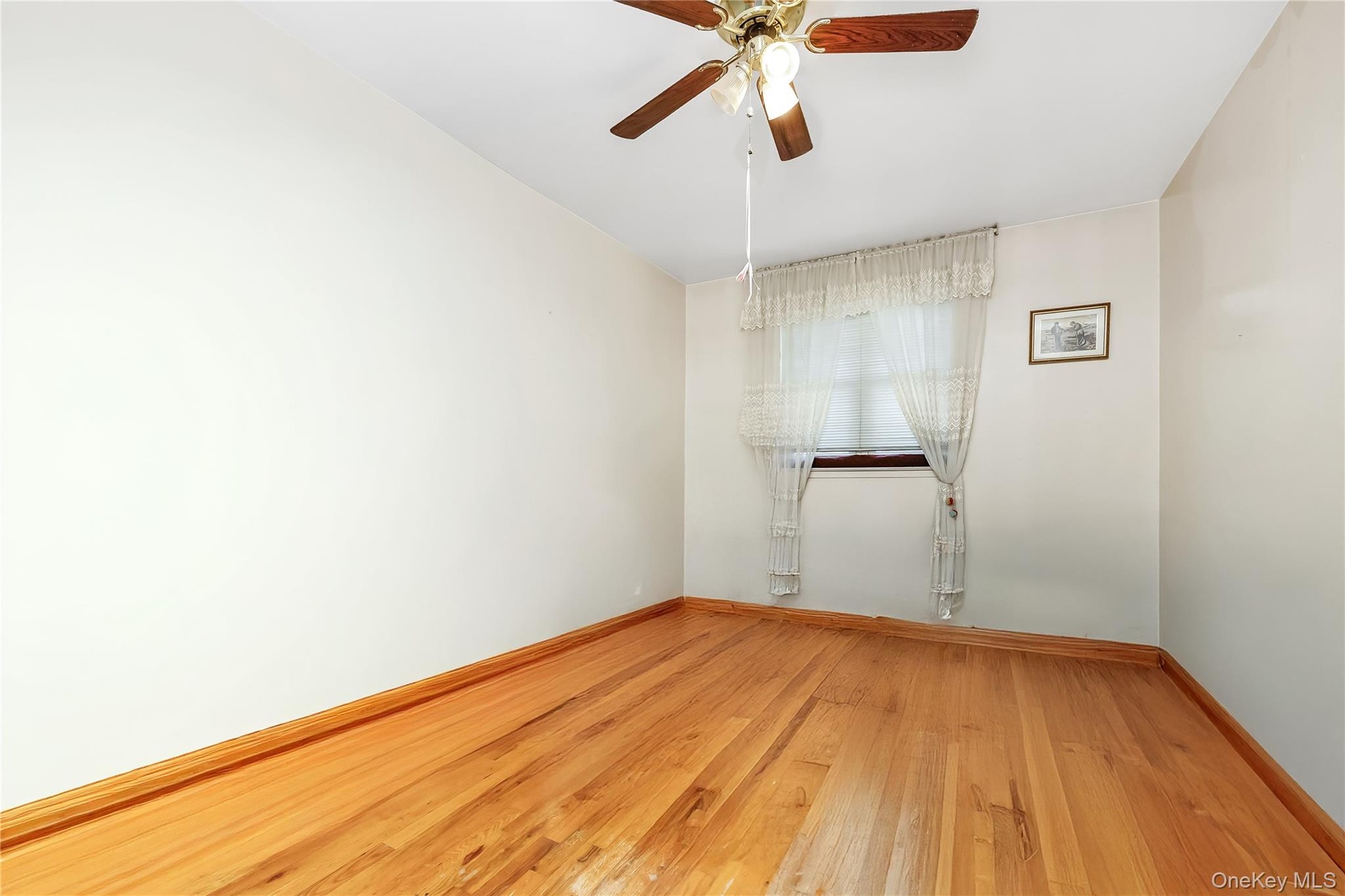 - Empty room featuring light wood-style flooring and a ceiling fan