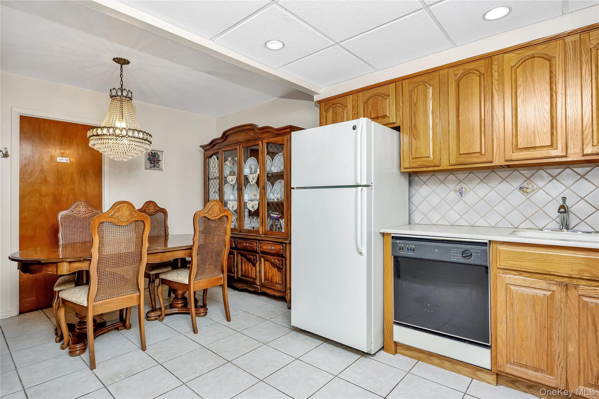- Kitchen featuring backsplash, decorative light fixtures, freestanding refrigerator, a chandelier, and light tile patterned floors
