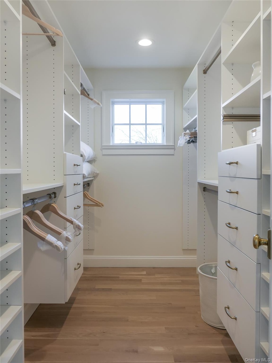 - Bedroom with wood finished floors, recessed lighting, a chandelier, and a closet