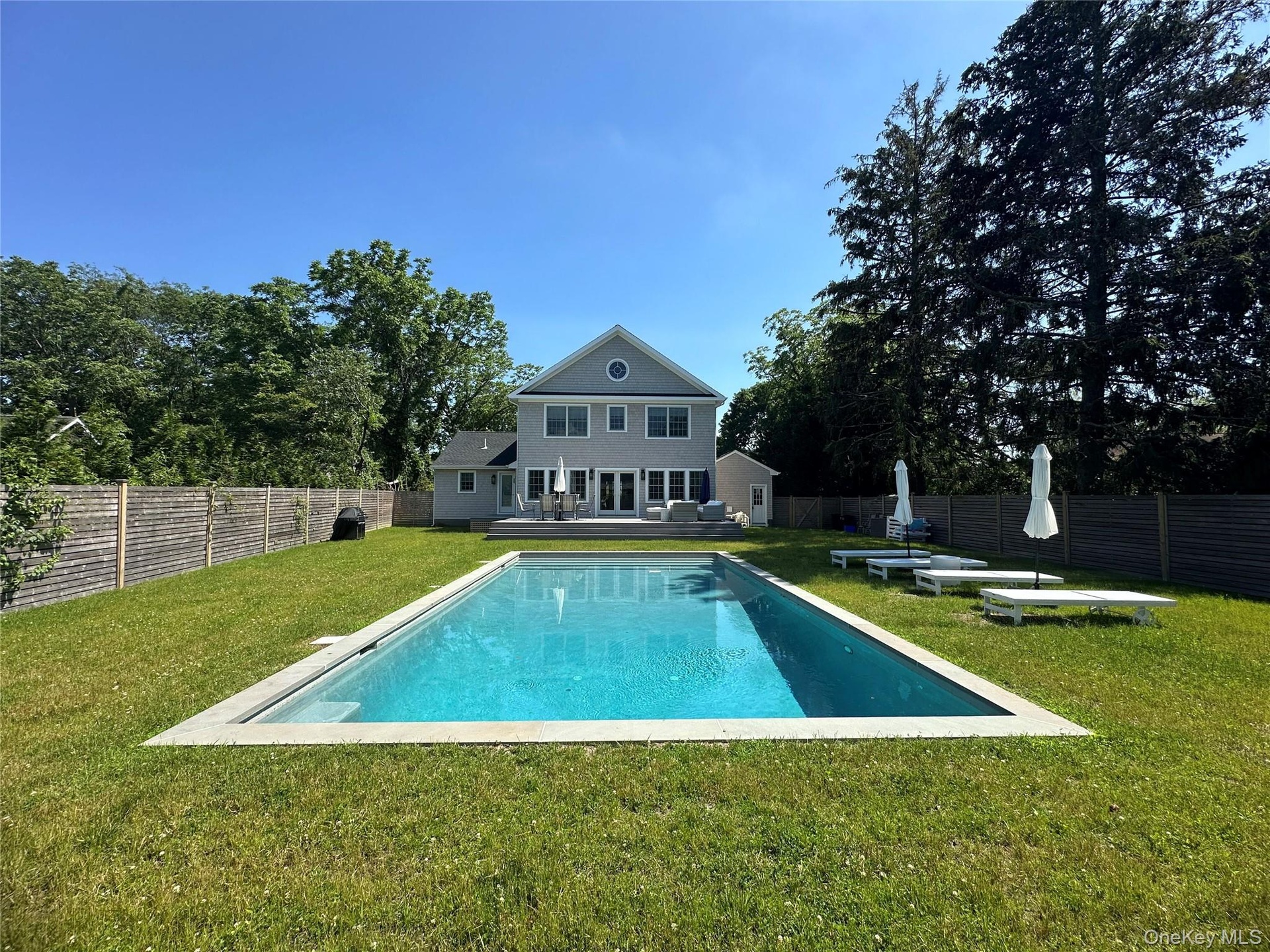 Nestled in the heart of Bellport Village, this exquisite 3 bedroom, 3.5 bath home offers the perfect blend of modern luxury and cozy comfort. Completely rebuilt in 2023/2024 this stunning home is located on a quiet cul de sac and perfect for those looking to enjoy serene village living just moments away from local shops, dining, and beautiful beaches. This home highlights an expansive open-concept and spacious living room with a gas fireplace and a formal dining area perfect for relaxing and entertaining. The heart of the home is the gorgeous new, chef inspired gourmet kitchen boasting Fisher & Paykel refrigerator, Miele oven, Bosch dishwasher and GE profile dual temperature wine refrigerator. The over sized central island and custom cabinetry finish off this spectacular setting where one will enjoy many memories. The first bedroom is a large, junior suite and is located on the first floor. This area boasts a huge closet and professionally designed bathroom with top of the line finishes. As you make your way up the oversized stairwell you will find the luxurious primary suite. This sun drenched area features a spectacular 17 X 18 foot sleeping area, bathroom with imported tile, slipper style bathtub with views of the pool and sophisticated glass paneled shower and large custom closet with built in shelving and drawers. The additional guest bedroom has Jack and Jill access to the full bath and is located directly across from the office/nursey. The oversized laundry room is upstairs for ultimate convenience. As you make your way outside you will find the composite board deck overlooking an inground gunite swimming pool, ideal for summer entertaining. The hand dipped cedar shingle give the quintessential, classic Bellport Village vibe. Other features include a one car garage, full basement, hardwood floors throughout, inground sprinkler system, fully fenced yard and so much more. All Village amenities included.