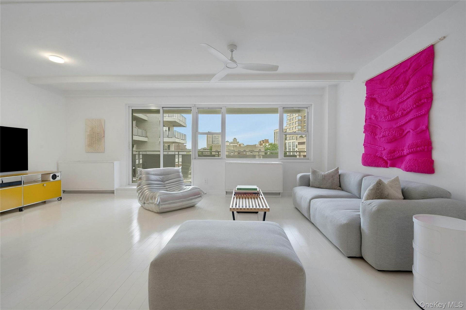 - Living area featuring beam ceiling, ceiling fan, and a city view