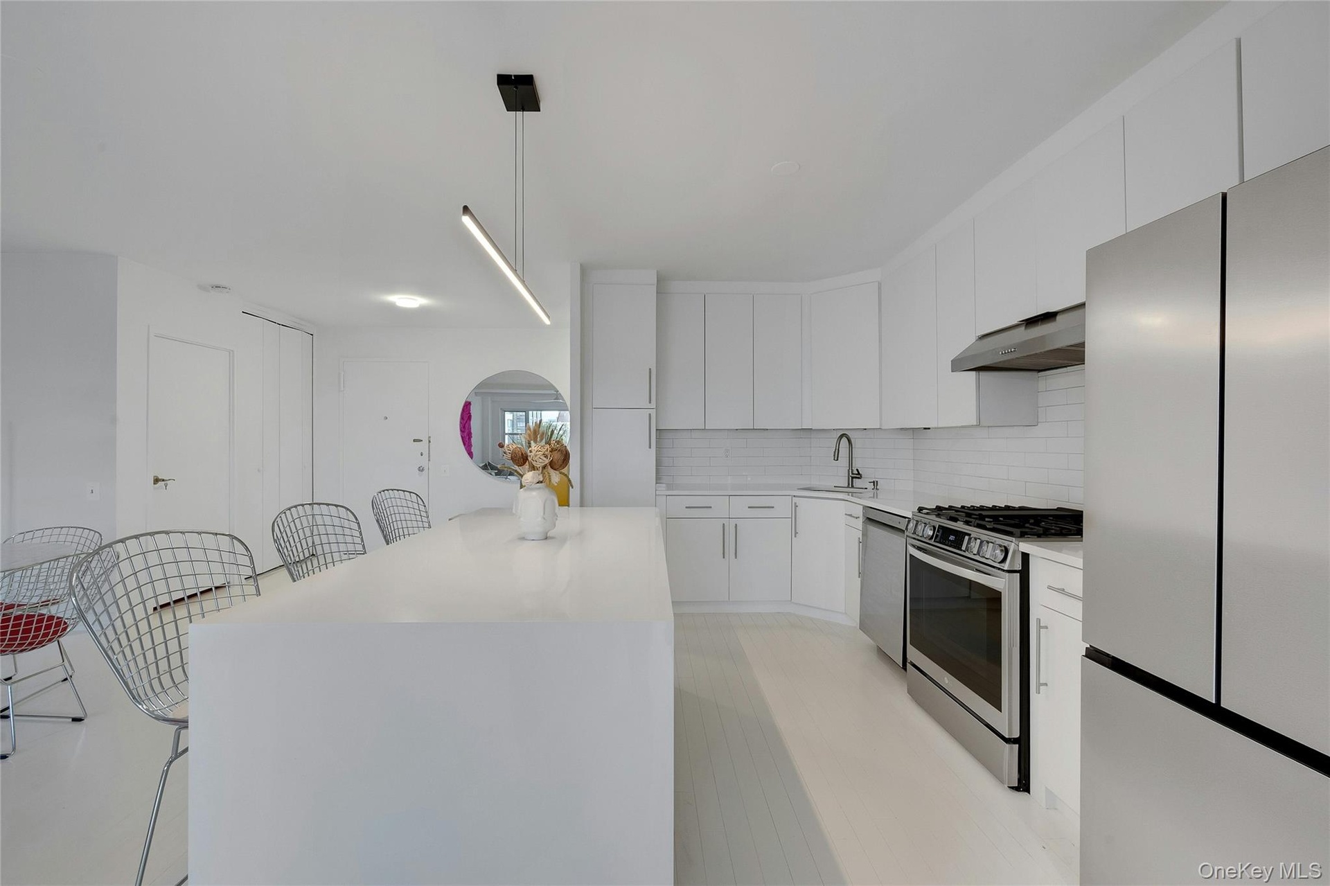 - Kitchen with backsplash, white cabinetry, appliances with stainless steel finishes, and a kitchen breakfast bar