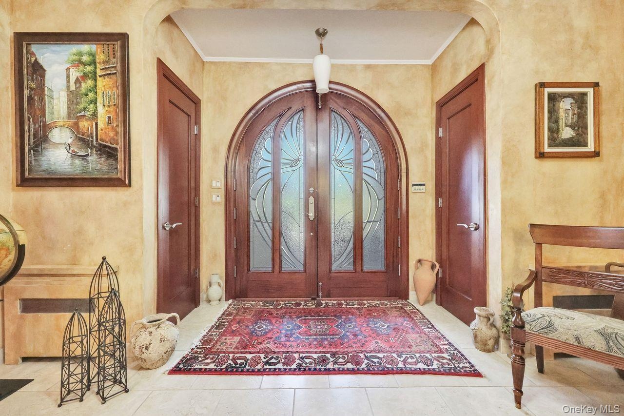 - Tiled entrance foyer featuring arched walkways, crown molding, and french doors