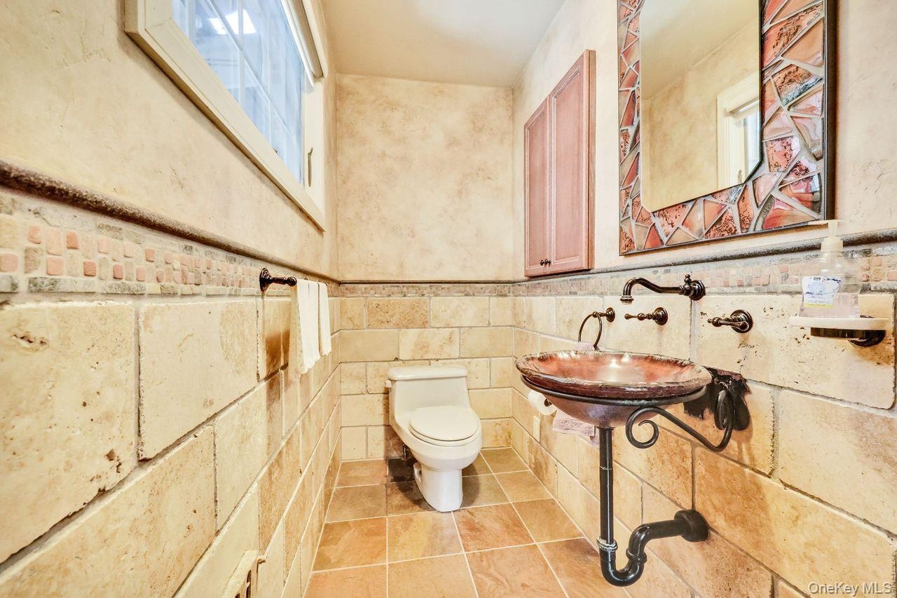 - Bathroom featuring tile patterned floors, tile walls, and wainscoting