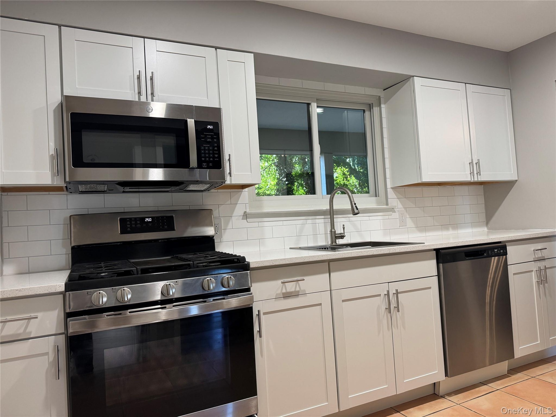 - New Kitchen with white cabinetry, light stone counters, and backsplash