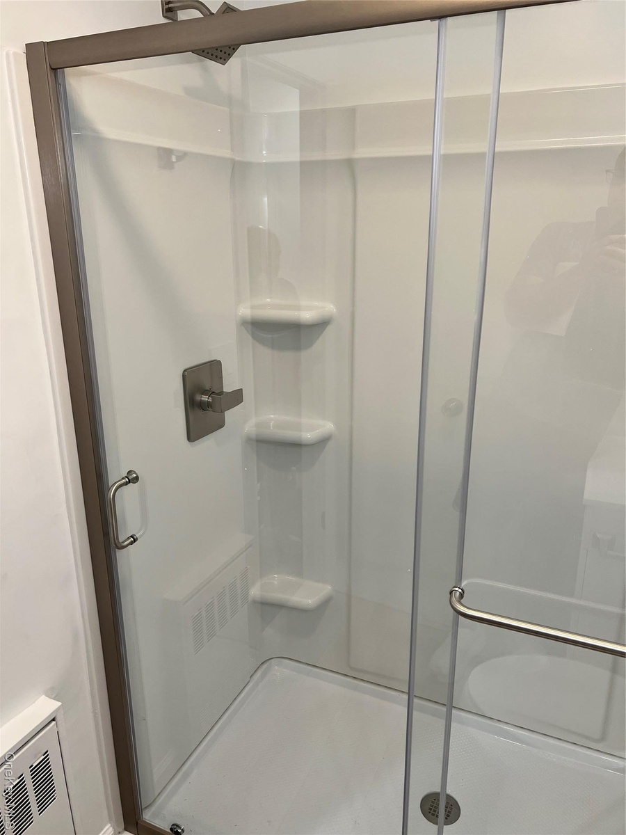 - Dining Rm with sliders to rear patio. Dark wood-type flooring, a baseboard heating unit, and a wall mounted AC