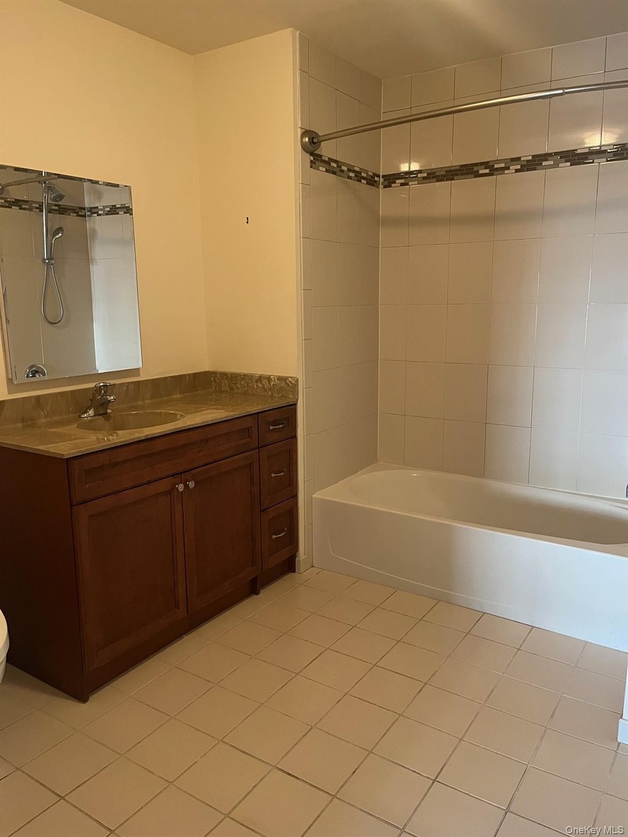 - Full bath with shower / washtub combination, vanity, and light tile patterned flooring