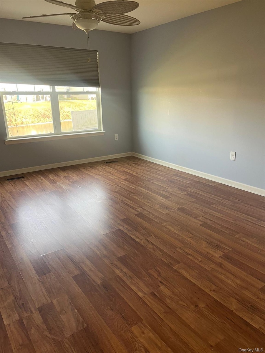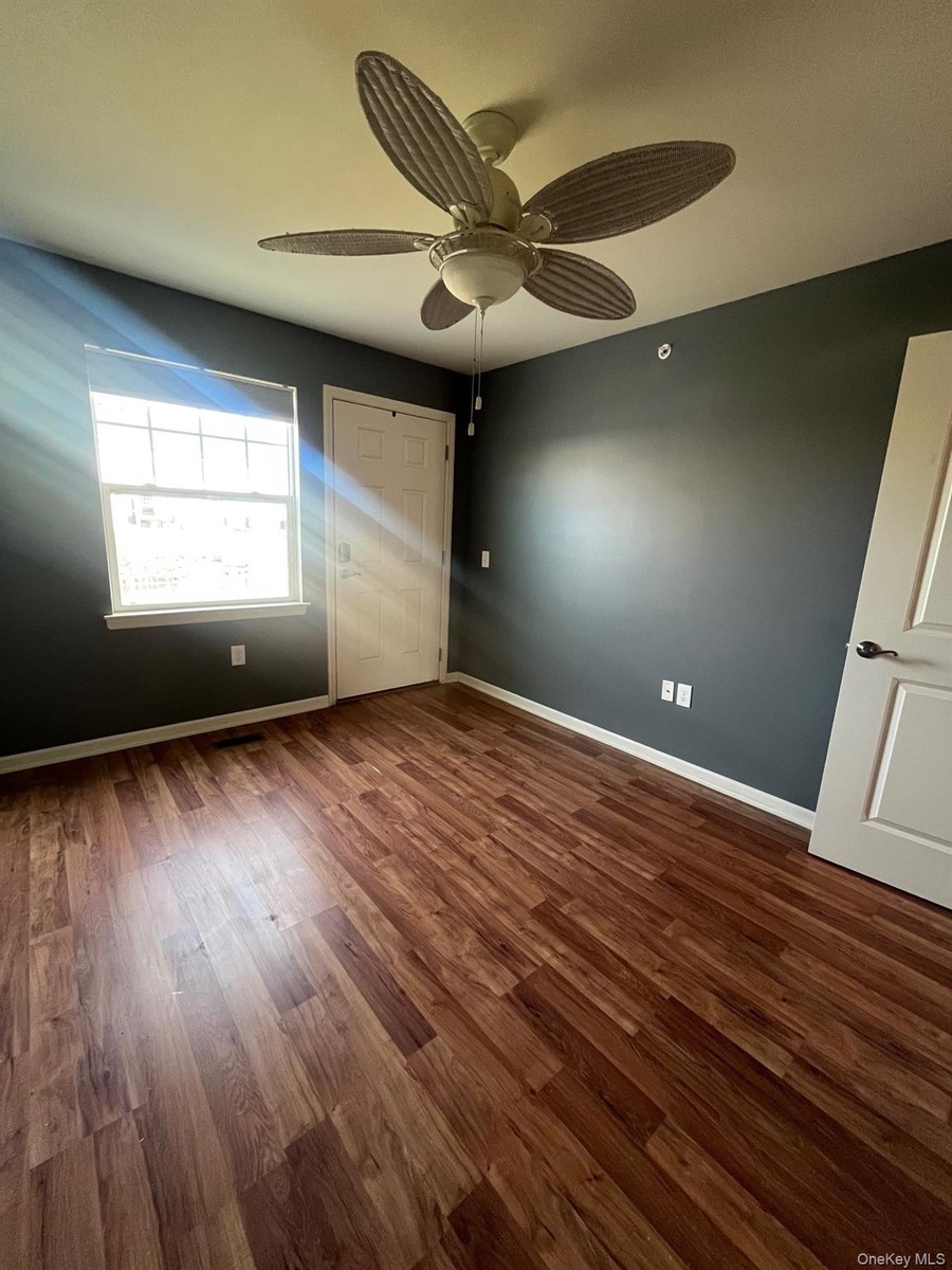 - Unfurnished room with ceiling fan and dark wood-style floors