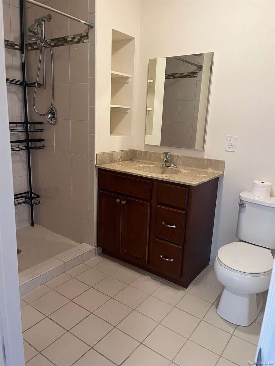 - Bathroom with vanity, light tile patterned floors, and a stall shower