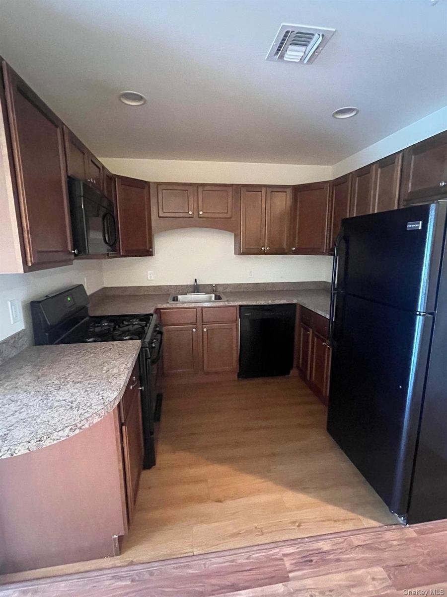 - Kitchen featuring black appliances, light wood-type flooring, and light countertops