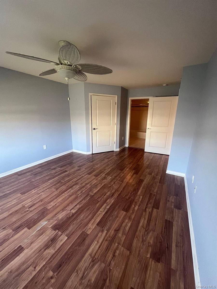 - Unfurnished bedroom with dark wood finished floors and a ceiling fan