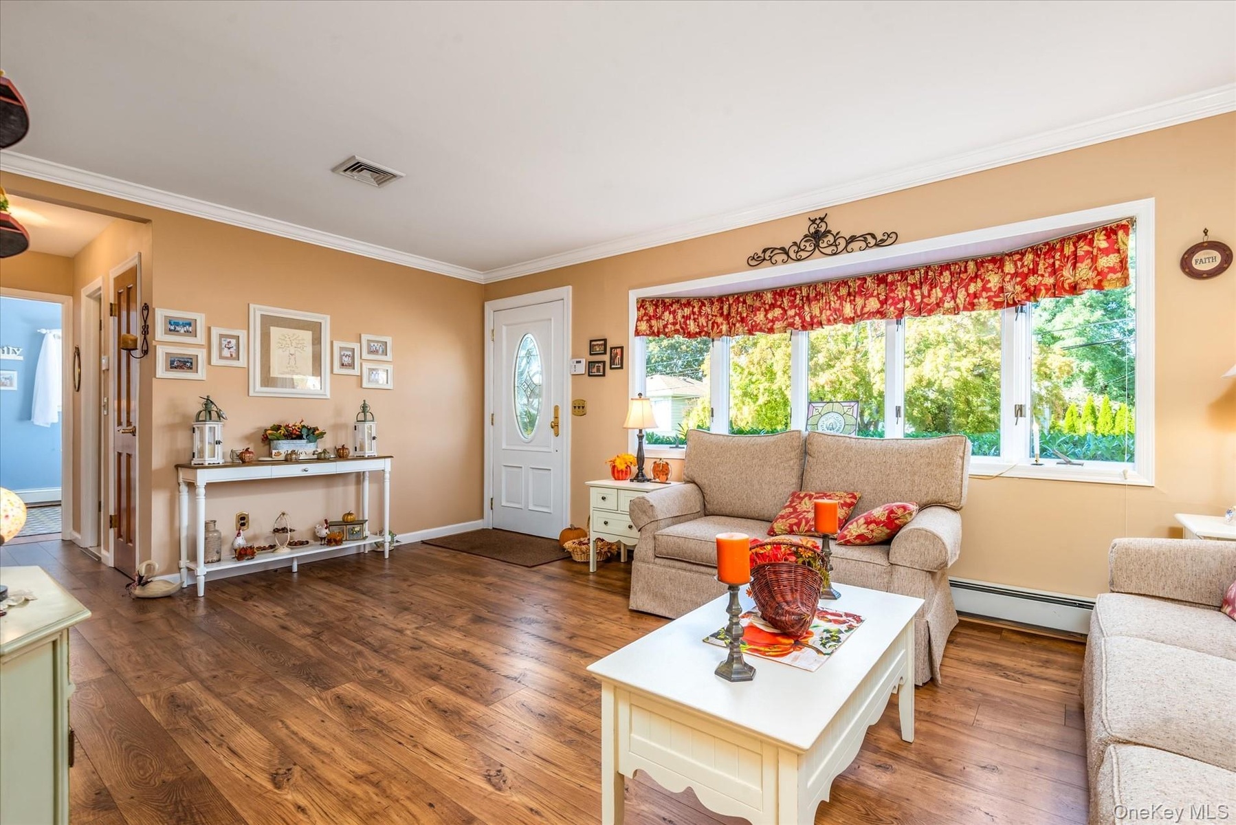 - Living room with dark wood finished floors, baseboard heating, crown molding, and healthy amount of natural light