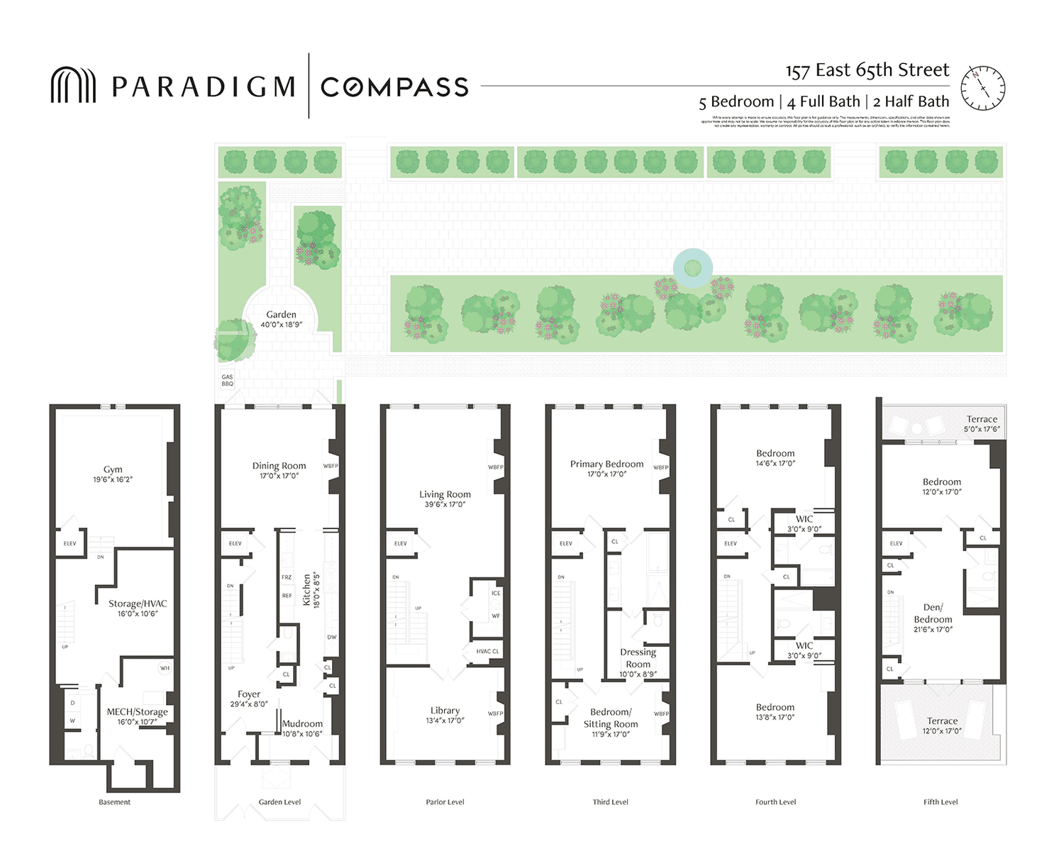 Fully renovated and turnkey, this immaculate 19th century brownstone sits on one of Manhattan's very few privately shared gardens. While situated within the garden community and the park-like landscape, the home still enjoys its own secluded sitting area and a hardwired gas grill. 157 East 65th Street is a grand, 5-bedroom, 4+ bathroom fully gut-renovated townhouse offering nearly 6,000 square feet of living space and rare access to the secluded gardens, invisible from the street and known only to neighboring residents. Built in the 1920s to replicate an English garden, Jones Wood Garden is a picturesque sanctuary that feels as though it were lifted from the pages of a fabled story, preserving the history of Old New York within the 12 brownstones along East 65th and 66th Streets. Modern touches define the interiors of this six-level home, which is connected by a stunning central staircase and elevator, thoughtfully designed for both elegance and functionality. There are two entrances - a formal foyer that feels gracious and welcoming and a service corridor with a mudroom. The light filled dining room features a wood-burning fireplace and direct access to the quarter-acre shared private garden, while the chef’s kitchen impresses with radiant-heated tile floors, stone countertops, walnut cabinetry, professional-grade appliances, custom sinks, built-ins, pantry, and a desk workspace. A tucked away marble-clad powder room completes this level. Ascending to the parlor floor, the great room stuns where solid oak, rift and quarter sawn floors anchor the space beneath the nearly 12-foot soaring ceilings. Three magical floor-to-ceiling windows flood the room with light, while the main picture window, measuring 7 by 9’, perfectly frames views of the manicured gardens and elegant fountain. This level also offers two wood-burning fireplaces, a library with custom millwork, and a complete wet bar with an ice maker and wine fridge. The primary suite, occupying the entire third floor, features four oversized windows framing serene garden views and two limestone wood-burning fireplaces. The marble-clad five-fixture bath boasts radiant-heated floors, dual vanities, a soaking tub with separate shower, and a handmade mosaic-tile floor. A corridor of custom closets provides abundant storage, while an additional front room offers flexible space for a sitting room, office, dressing room or additional bedroom. The fourth floor offers two sun-filled bedrooms, each with an ensuite bath and private dressing area. Both feature bright exposures, high ceilings, and walk-in closets with ample storage. On the fifth floor, a bedroom overlooking the garden boasts a private terrace, while an adjacent lofty den, bathed in natural light from a skylight and features 10-foot ceilings, opens onto a south-facing terrace. This versatile loft can serve as a home office, additional sixth bedroom, or creative studio, with the terrace offering an exceptional setting for entertaining. The excavated lower level features a full-height gym, a multipurpose room, a powder room, and a separate laundry area, all complemented by robust technology infrastructure, mechanicals, and abundant storage. The space is exceptionally clean, organized, and meticulously maintained. Additional features of the home include a private elevator serving all floors and a Savant Pro system that seamlessly integrates automated Lutron lighting, motorized shades, Sonos sound system, and a state-of-the-art digital security suite with cameras, intercom, and key-fob/key-card access. Individual climate control ensures every room remains perfectly comfortable year-round. Located in the heart of Lenox Hill, this home is moments from the neighborhood’s world class restaurants and shopping along with picturesque tree lined blocks and cafes and shops, while still offering quick access to Midtown. Fully turnkey, it provides everything the Upper East Side has to offer, simply bring your decorator and mo