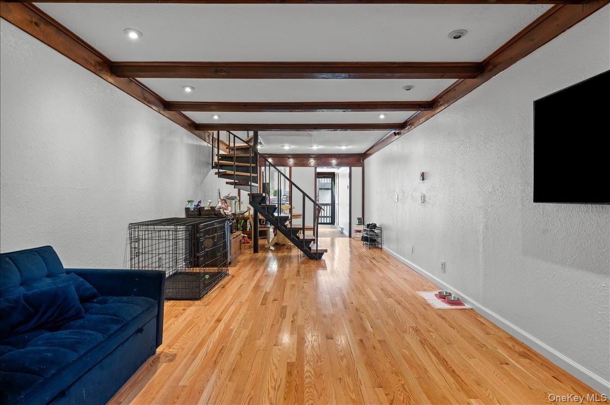 - Living room with a textured wall, stairs, wood finished floors, and beam ceiling