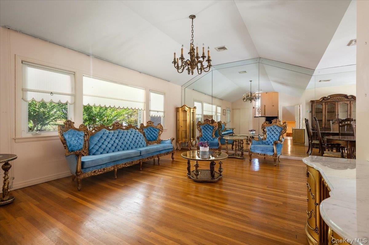 - Living area with lofted ceiling, dark wood-style flooring, and a chandelier