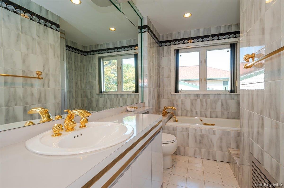 - Bathroom featuring tile walls, light tile patterned floors, a bath, vanity, and recessed lighting