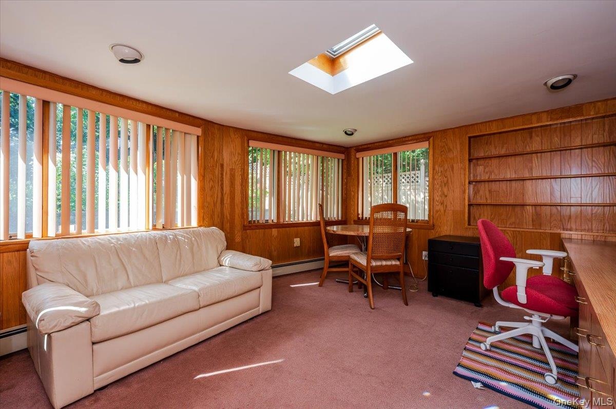 - Carpeted office featuring wood walls and a skylight