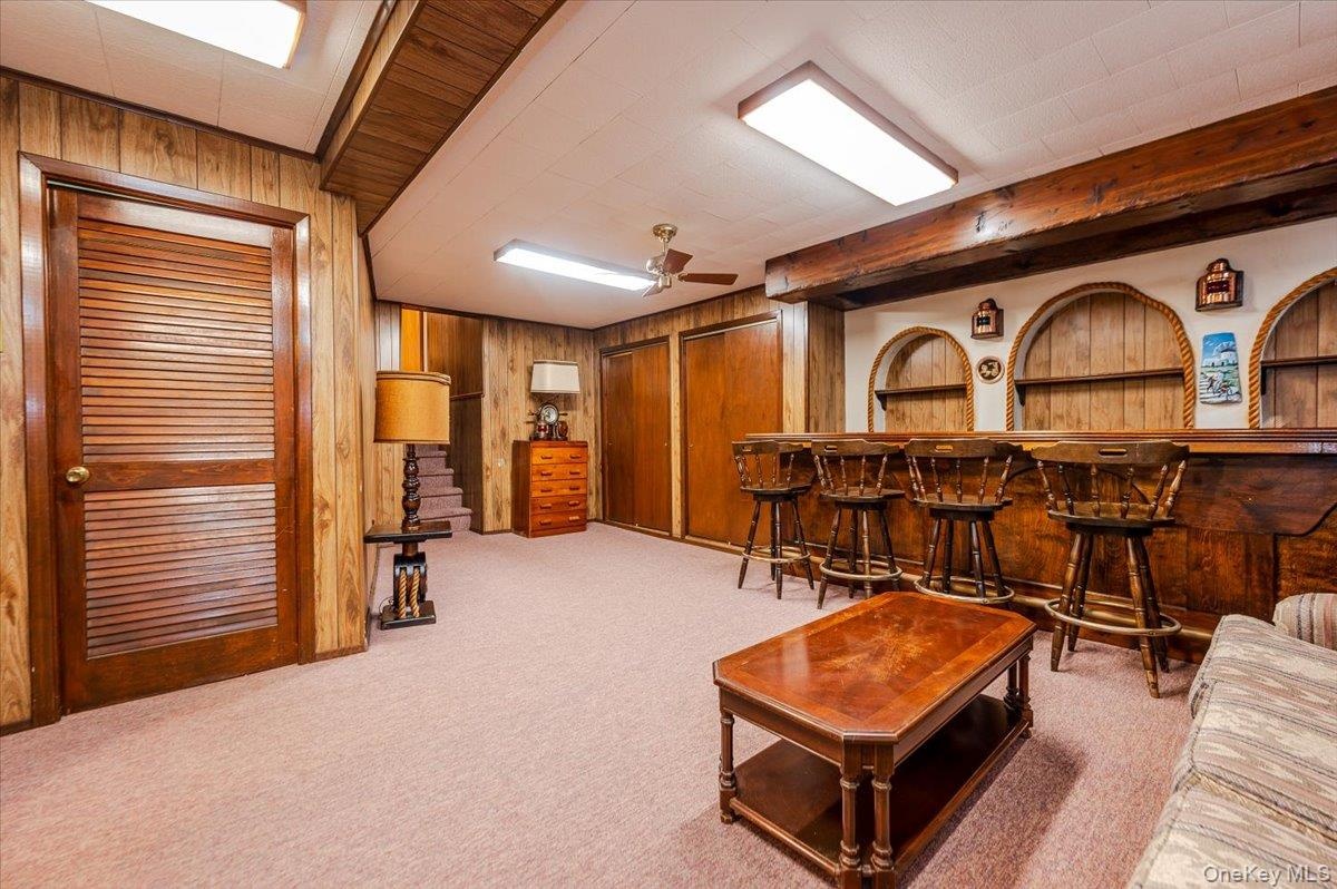 - Living area with wooden walls, light carpet, a dry bar, a ceiling fan, and stairs