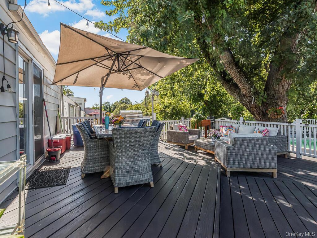 - Deck with an outdoor living space, outdoor dining space, pool, and grilling area