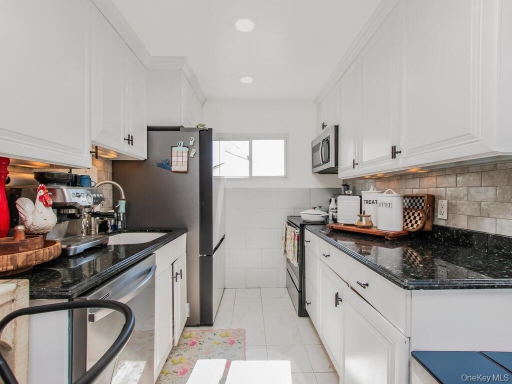 - Kitchen featuring white cabinetry, stainless steel appliances, dark stone countertops, tile walls, and recessed lighting