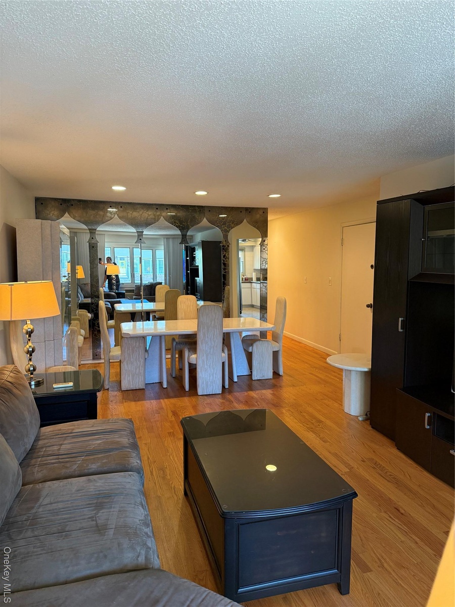- Living area featuring light wood-style floors, a textured ceiling, and recessed lighting