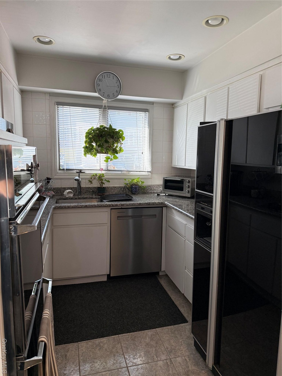 - Kitchen with refrigerator, dishwasher, dark stone counters, dark tile patterned floors, and white cabinets