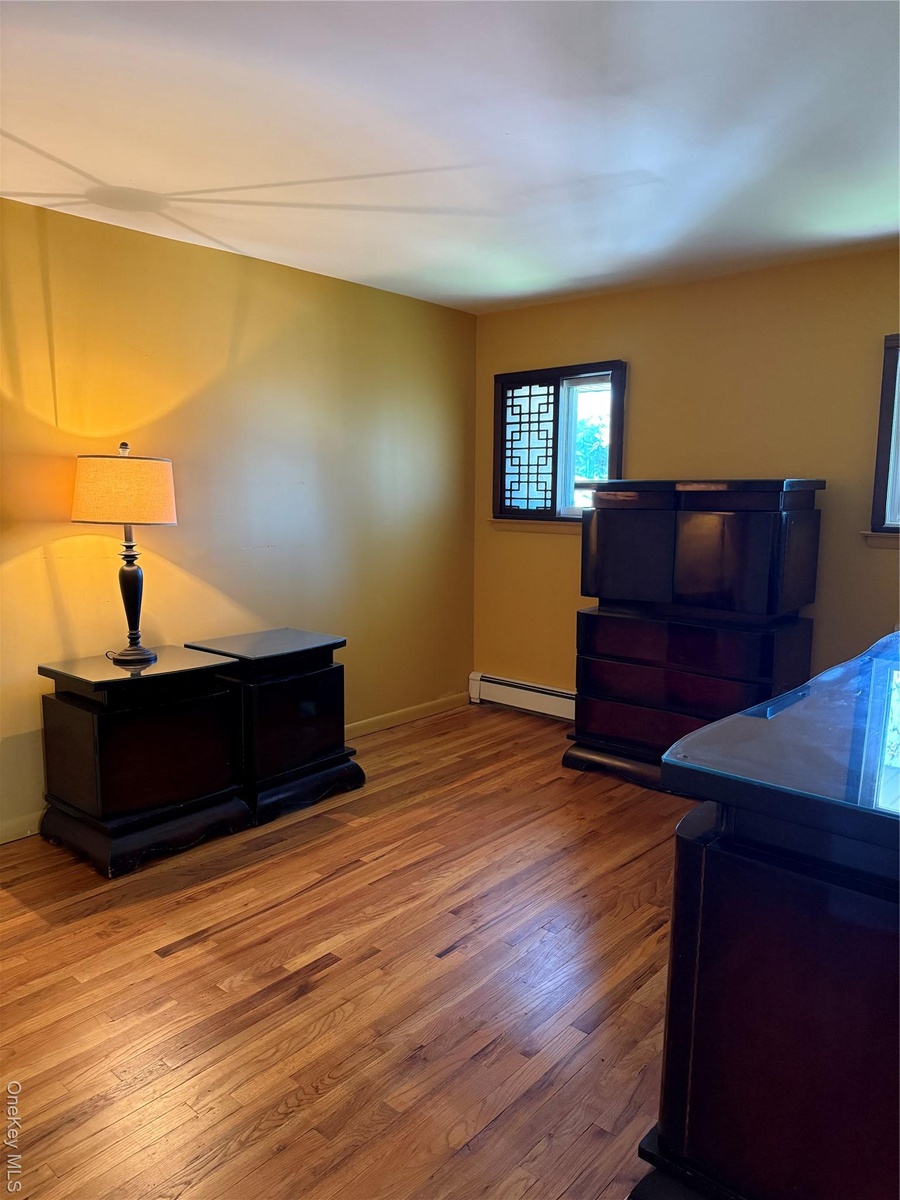 - Bedroom featuring wood-type flooring and a baseboard heating unit