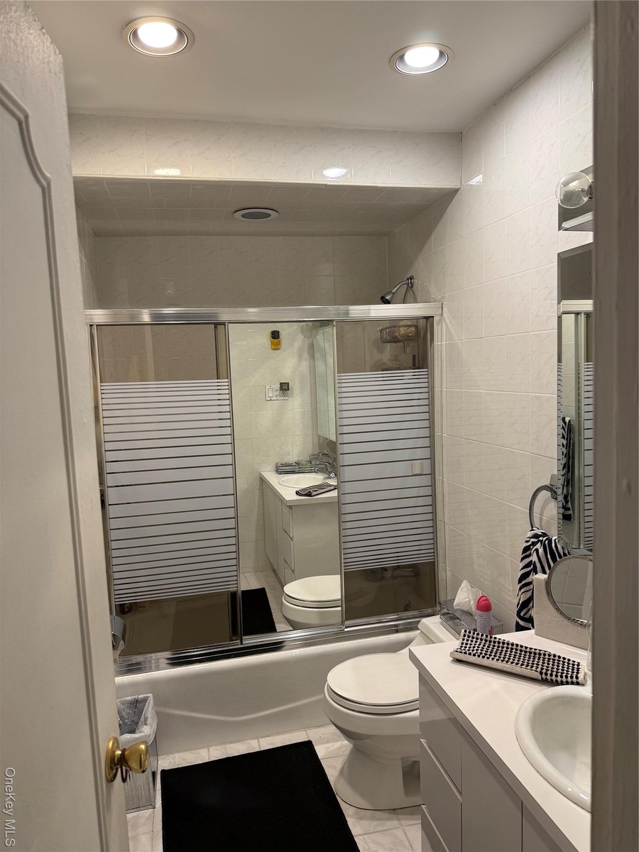 - Full bath featuring vanity, a stall shower, tile walls, and recessed lighting
