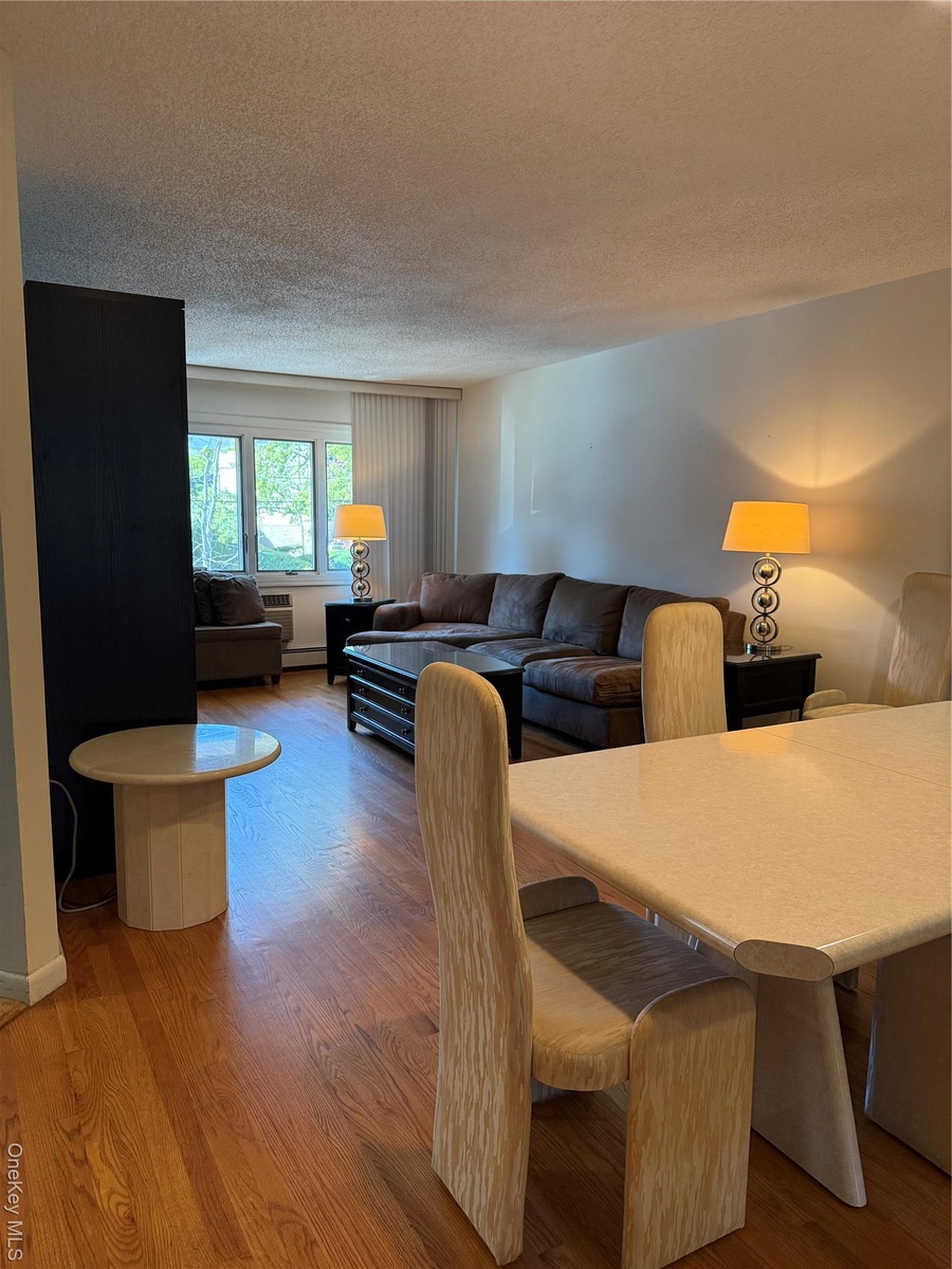 - Living area with wood finished floors, a textured ceiling, and a baseboard heating unit