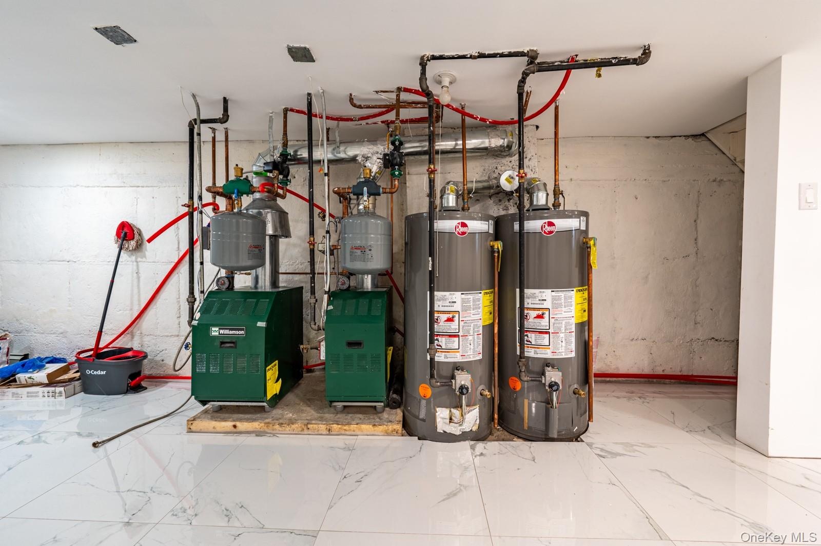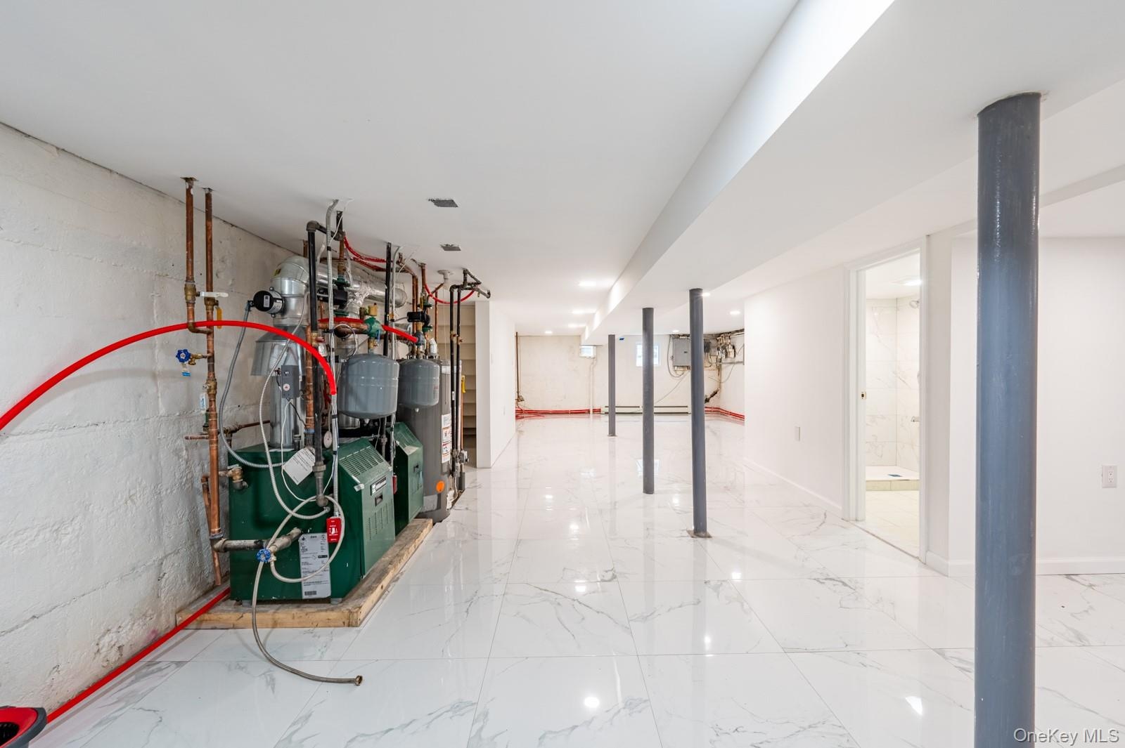 - Finished below grade area featuring baseboard heating, stairway, recessed lighting, and marble finish floors