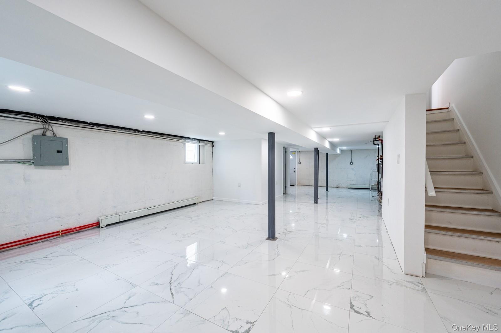 - Basement with stairs, a baseboard radiator, light marble finish flooring, electric panel, and recessed lighting