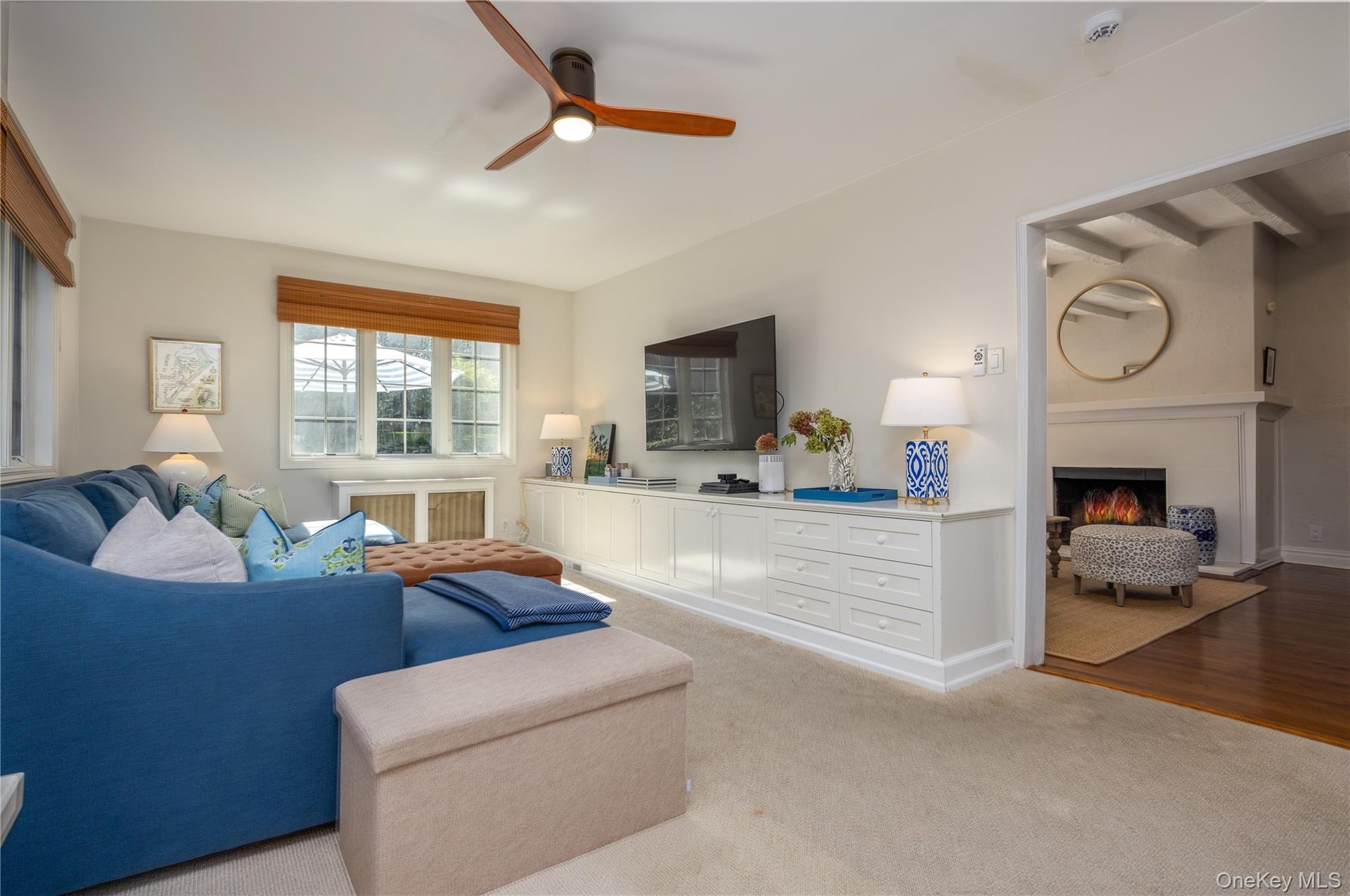 - Living room featuring radiator, light colored carpet, plenty of natural light, and a ceiling fan
