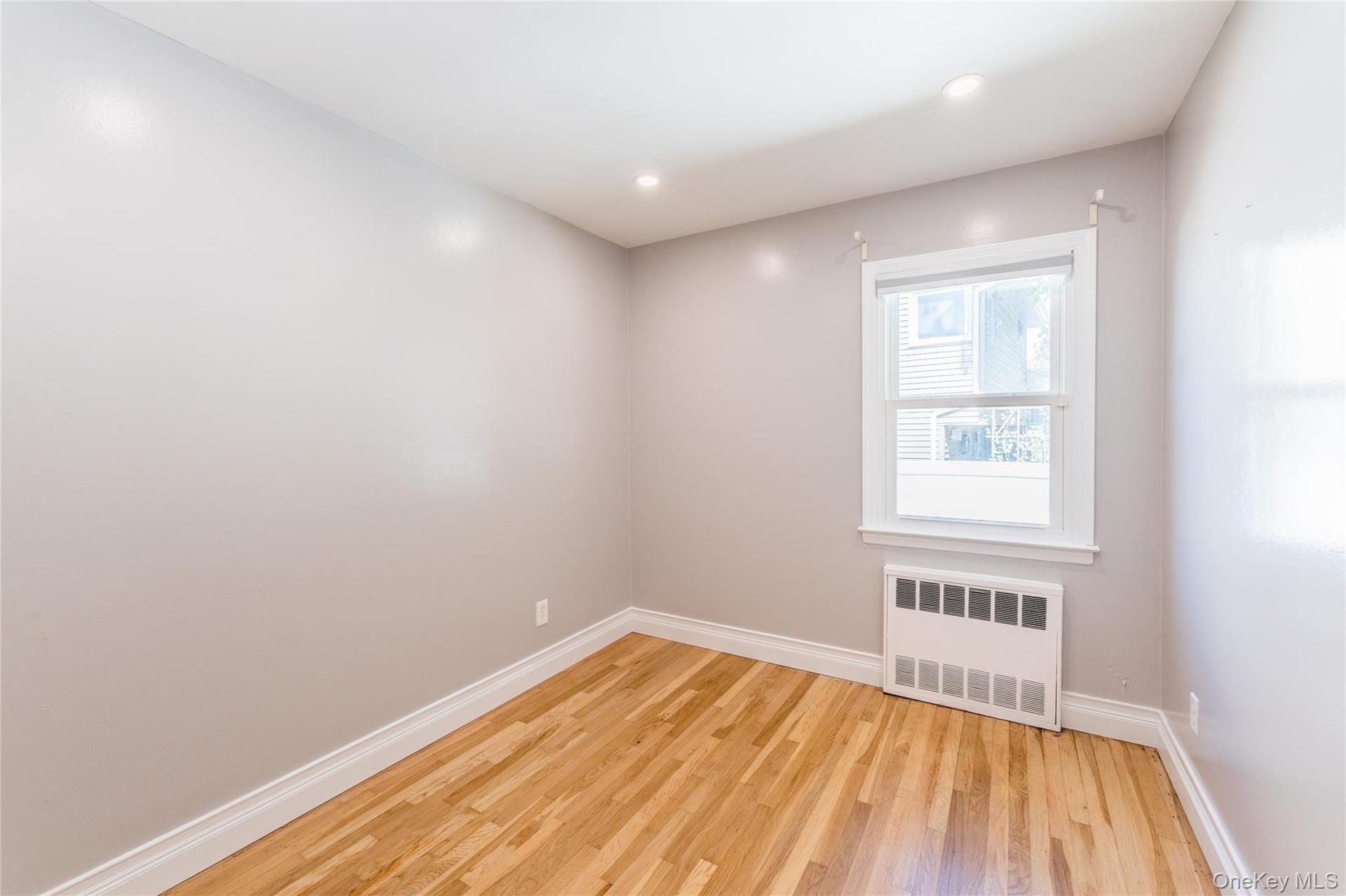 - Empty room featuring light wood-type flooring, radiator, and recessed lighting