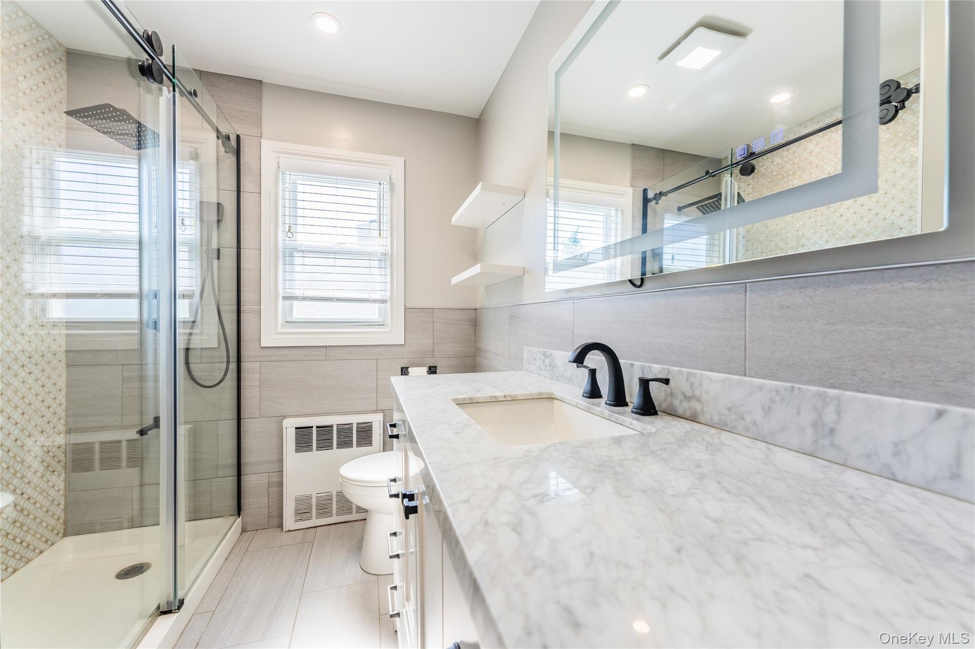 - Bathroom featuring vanity, tile walls, radiator heating unit, a shower stall, and light tile patterned floors