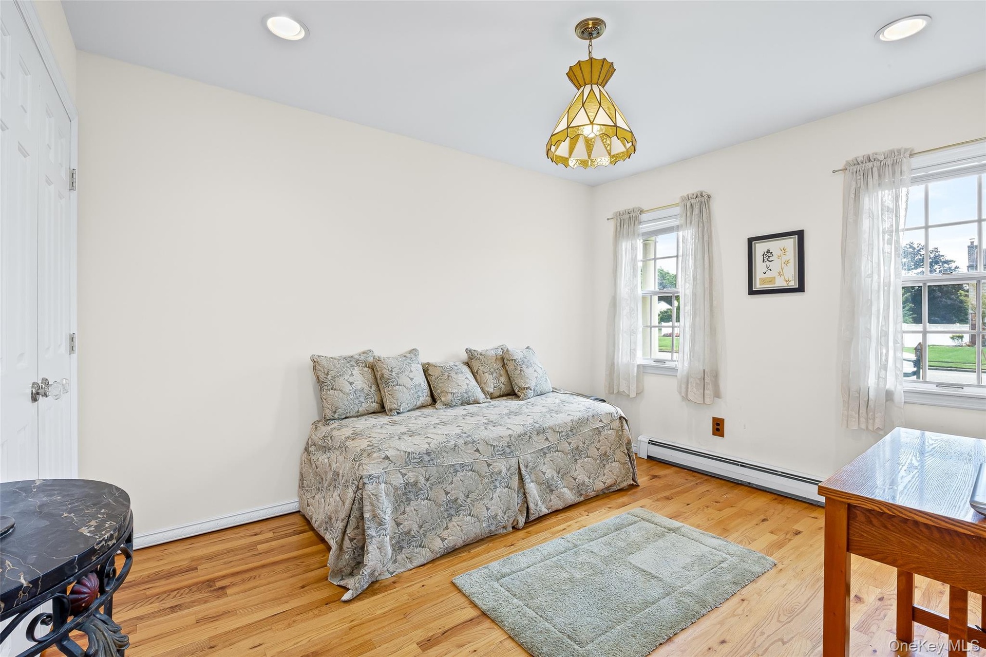 - Bedroom featuring a baseboard radiator, wood finished floors, and recessed lighting